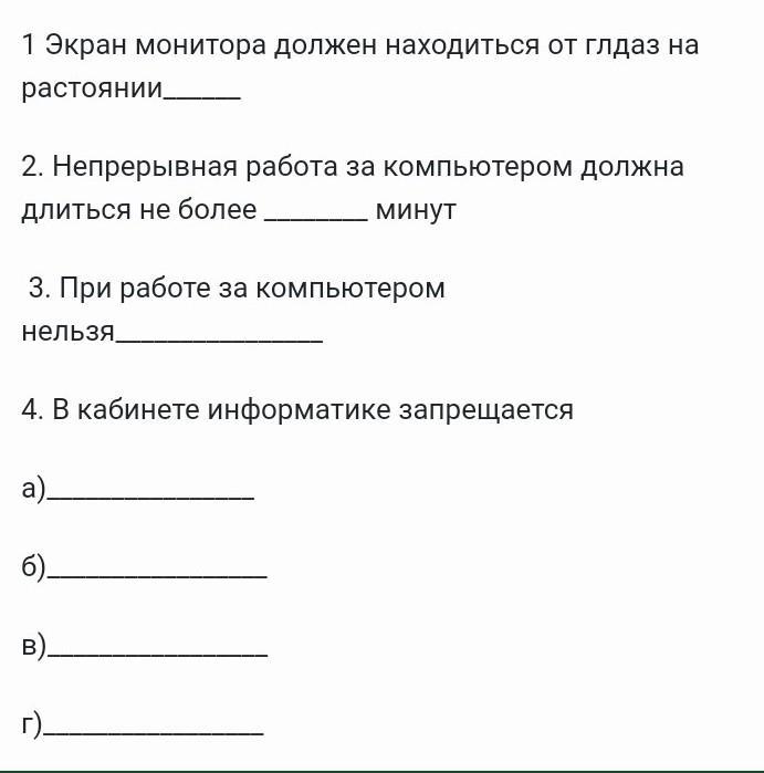 4: а) Приносить и запускать компьютерные игры, б) Работать при плохом самочувствии, в)Мешать работе других учащихся и преподавателя, г) Работать с грязными руками.