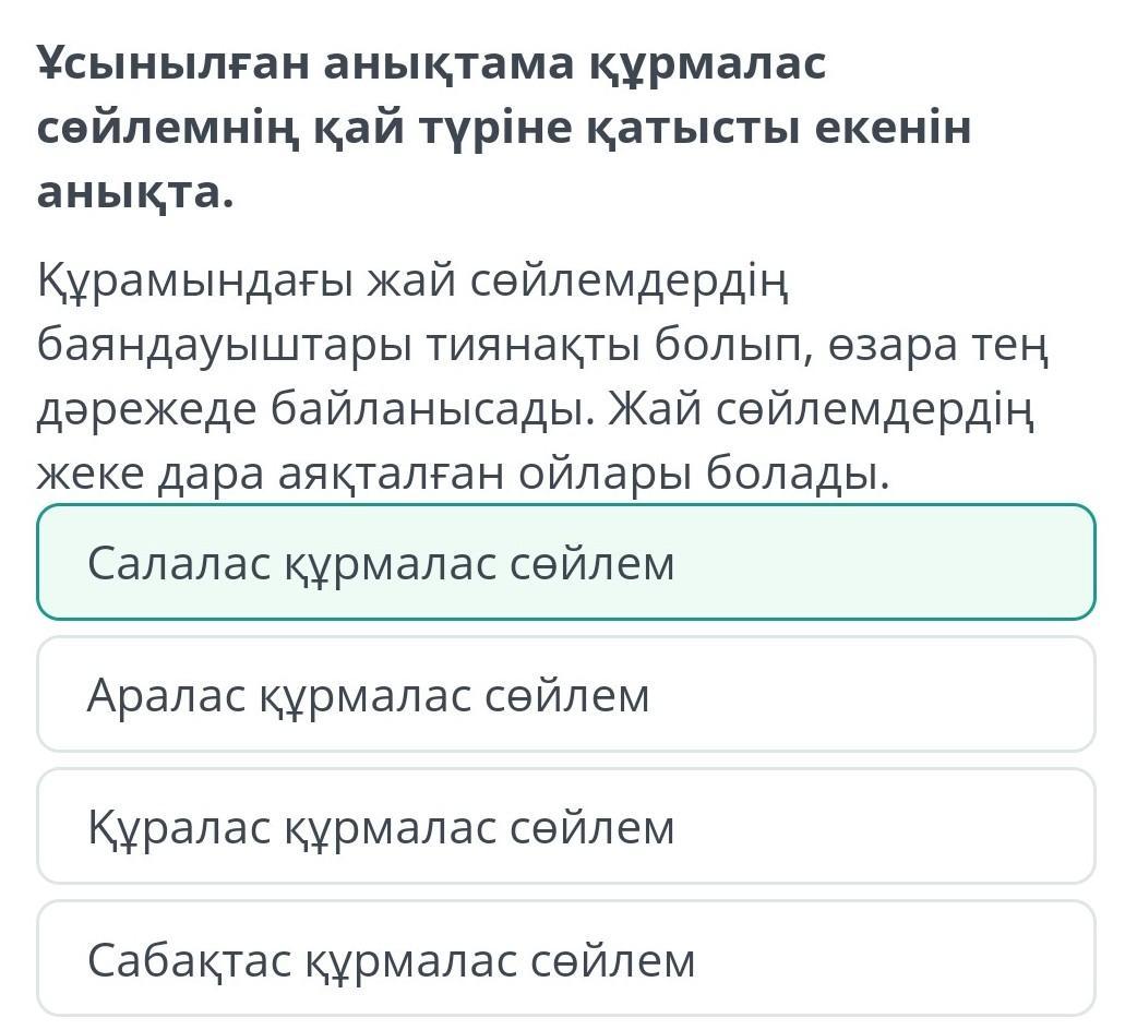 Ұсынылған анықтама құрмалас сөйлемнің қай түріне қатысты екенін анықта.
