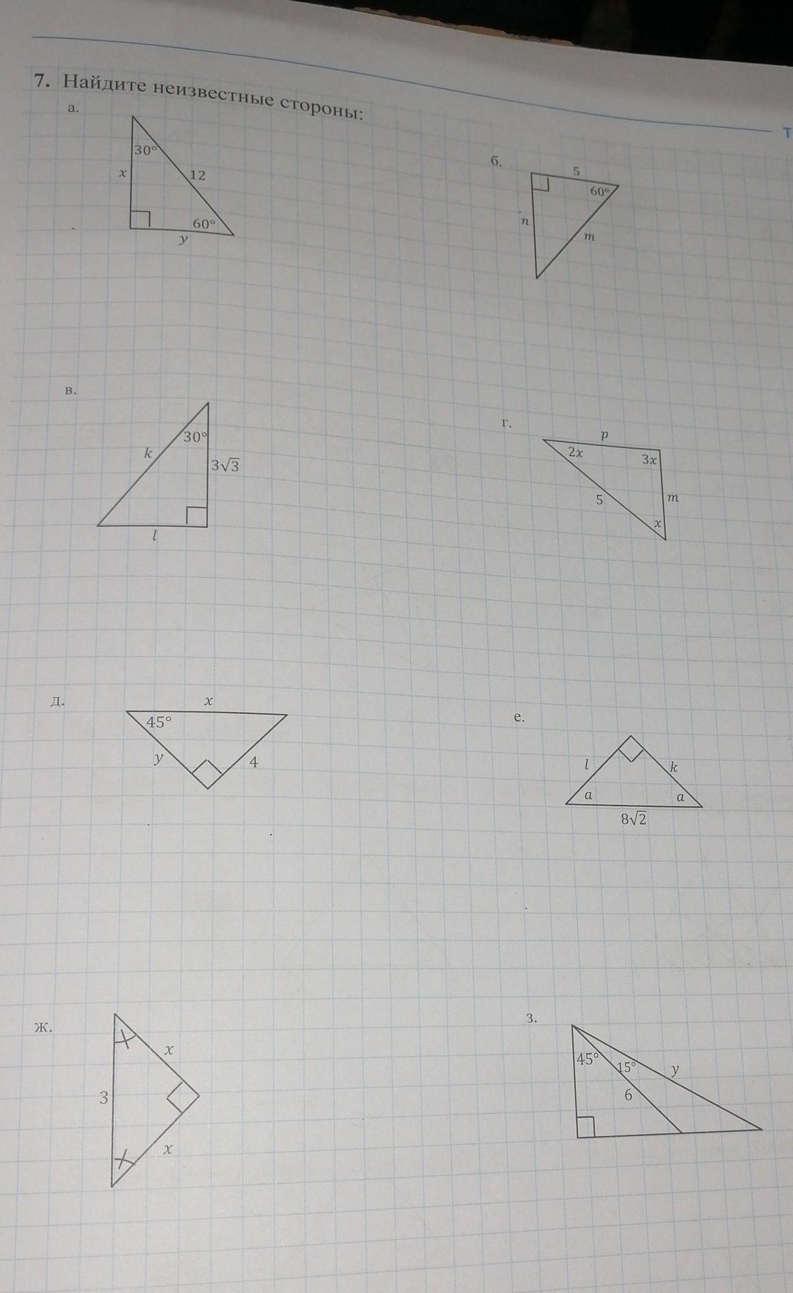 А) там прямокутний трикутник у якого кут 30° це означає, що катет який лежить навпроти цього кута (у) =половині гіпотенузи (12÷2=6), а дольше знайди х по теоремі піфогора