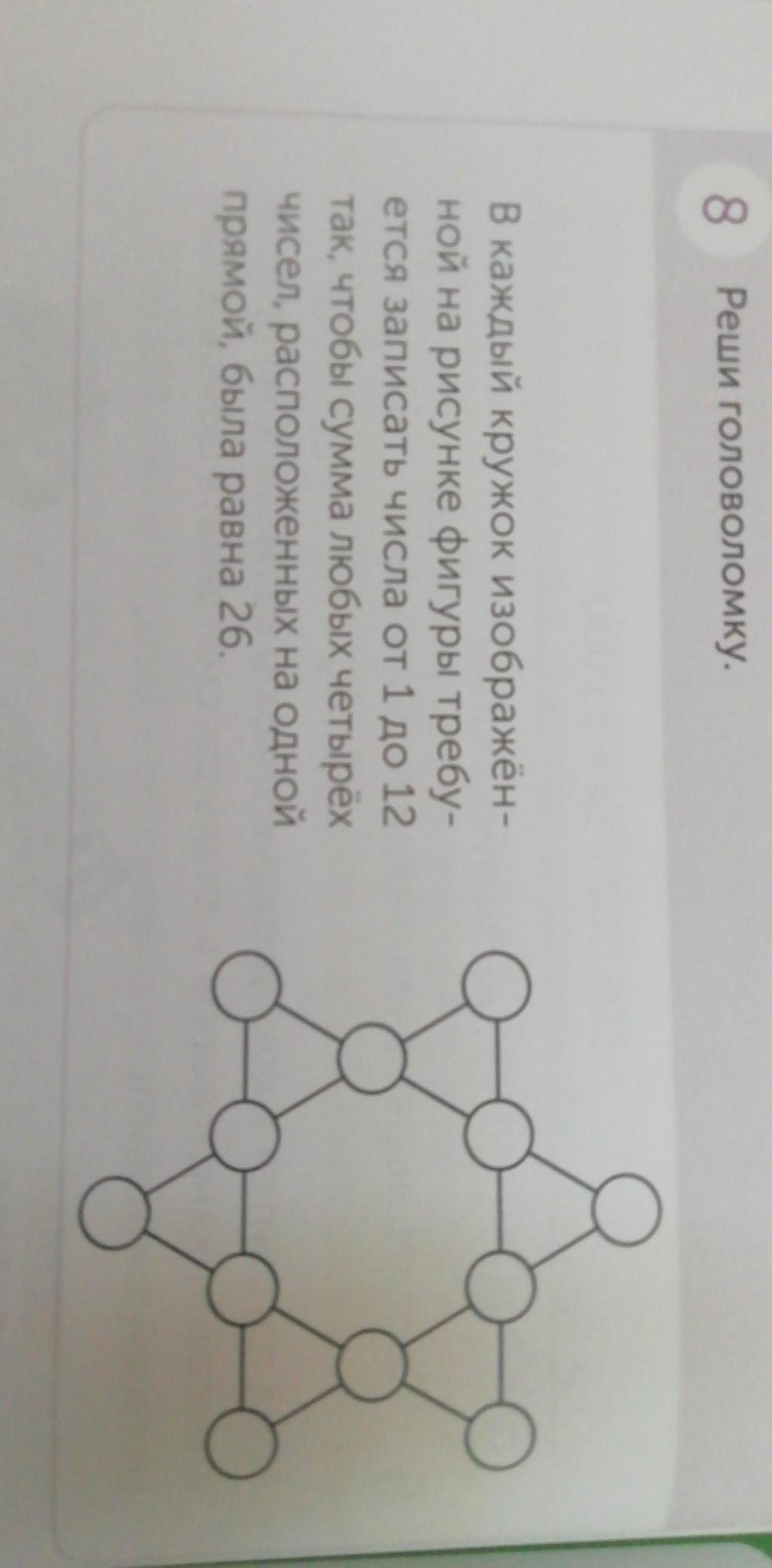 В каждый кружок изображённые на рисунке фигуры требуется записать числа от 1 до 12 так, чтобы сумма любых четырёх чисел, расположенных на одной прямой, была равна 26.