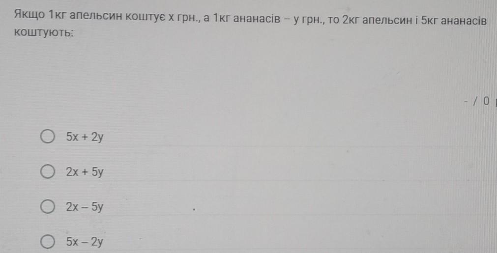Так как 2кг апельсин это Х, а 5кг ананас это У, то уравнение получается 2х+5у