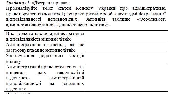 Заповнити таблицю з особливостей адміністративної відповідальності неповнлітніх (на фото)