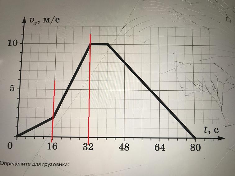 Старенький грузовичок резво стартовал на прямолинейном участке дорого. Но вскоре двигатель начал барахлить, и грузовик остановился. Зависимость проекции скорости грузовика на ось х(направление вдоль дороги) от времени показана на графике.