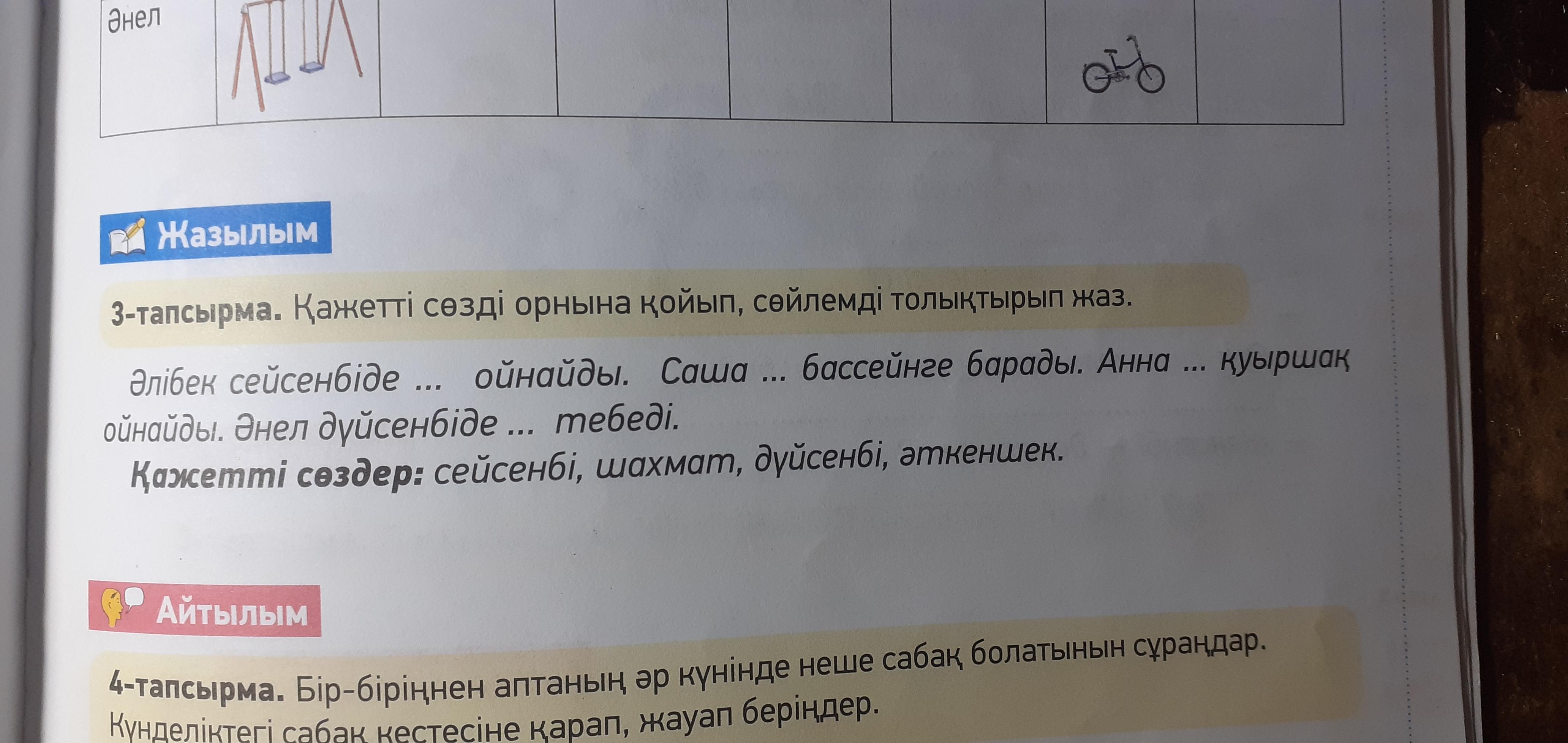 Әлібек сейсенбіде шахмат ойнайды. Саша дүйсенбі бассейнге барады. Анна сейсенбі қуыршақ ойнайды. Әнел дүйсенбіде әткеншек тебеді.
