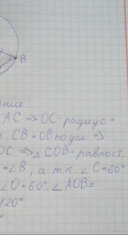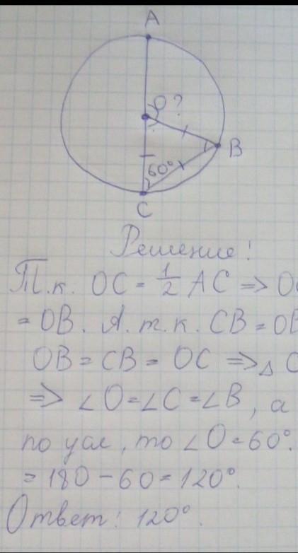 Дана окружность с центром О, в ней проведён диаметр АС,который равен хордам АВ и ВС,которые между собой тоже равны .Найти угол АОВ.Пожалуйста с чертижем