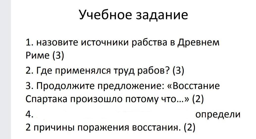 3. Основными причинами восстания Спартака, защитника угнетённых , стали: Рост числа военнопленных в завоеванных землях, становившихся рабами. У рабов не было никаких прав, к ним относились, как к вещам. Рабы трудились на рудниках, каменоломнях, в шахтах.