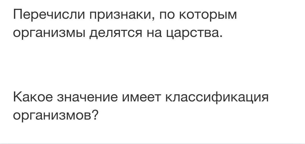 Царства: животные, растения, грибы, бактерии, вирусы. Царство - максимально большая группировка организмов по сумме признаков: строение тела (строение клетки), способ питания, способность к передвижению. Царства делят на типы (у растений - отделы), типы на классы, классы на отряды (у растений - порядки), отряды на семейства, семейства на роды, роды на виды. Например, вид растений “яблоня домашняя” принадлежит к семейству “розовые”, порядку “розоцветные”, классу двудольных, отделу “цветковые”, царству “растения”.