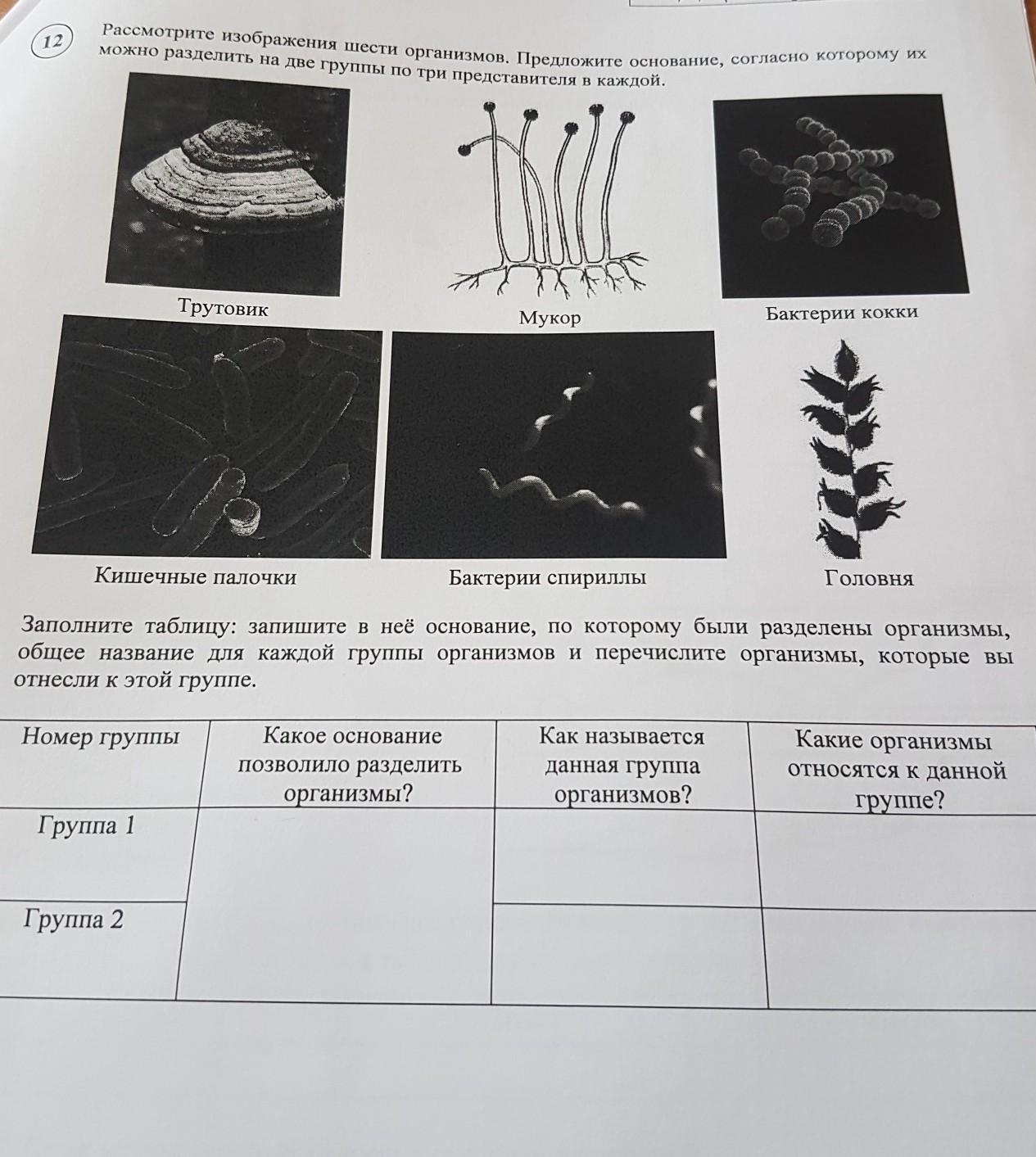 первая группа это бактерии вторая группа это растение К первой группе относятся головня трутовик к бактериям относятся кишечная палочка бактерии спириллы и бактерии кокки