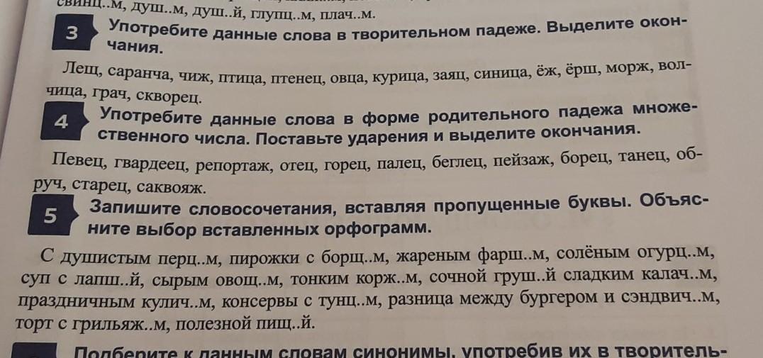 3.Лещом, саранчой, чижом, птицей, овцой, курицей, зайцем, синицей, ежом, ершом, моржом, волчицей, грачом, скворцом. (__ - окончание)