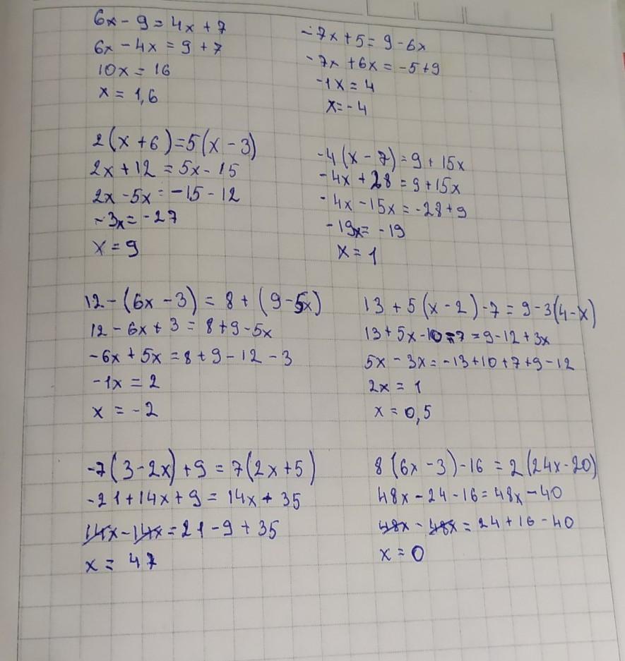 1). 6х - 9 = 4х + 7 2). - 7х + 5 = 9 - 6х 3). 2(х + 6) = 5(х - 3) 4) -4(х - 7) = 9 + 15х 5) 12 - (6х - 3) = 8 + (9 - 5х) 6) 13 + 5(х - 2) - 7 = 9 - 3(4 - х) 7) -7(3- 2х) + 9 = 7(2х + 5) 8) 8(6х - 3) - 16 = 2(24х -20)