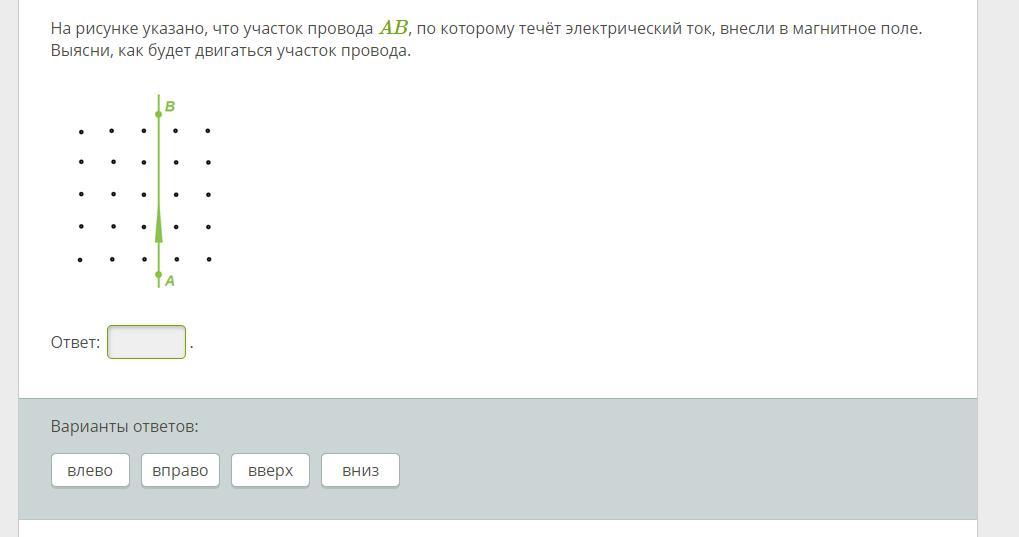 На рисунке указано, что участок провода AB, по которому течёт электрический ток, внесли в магнитное поле. Выясни, как будет двигаться участок провода.