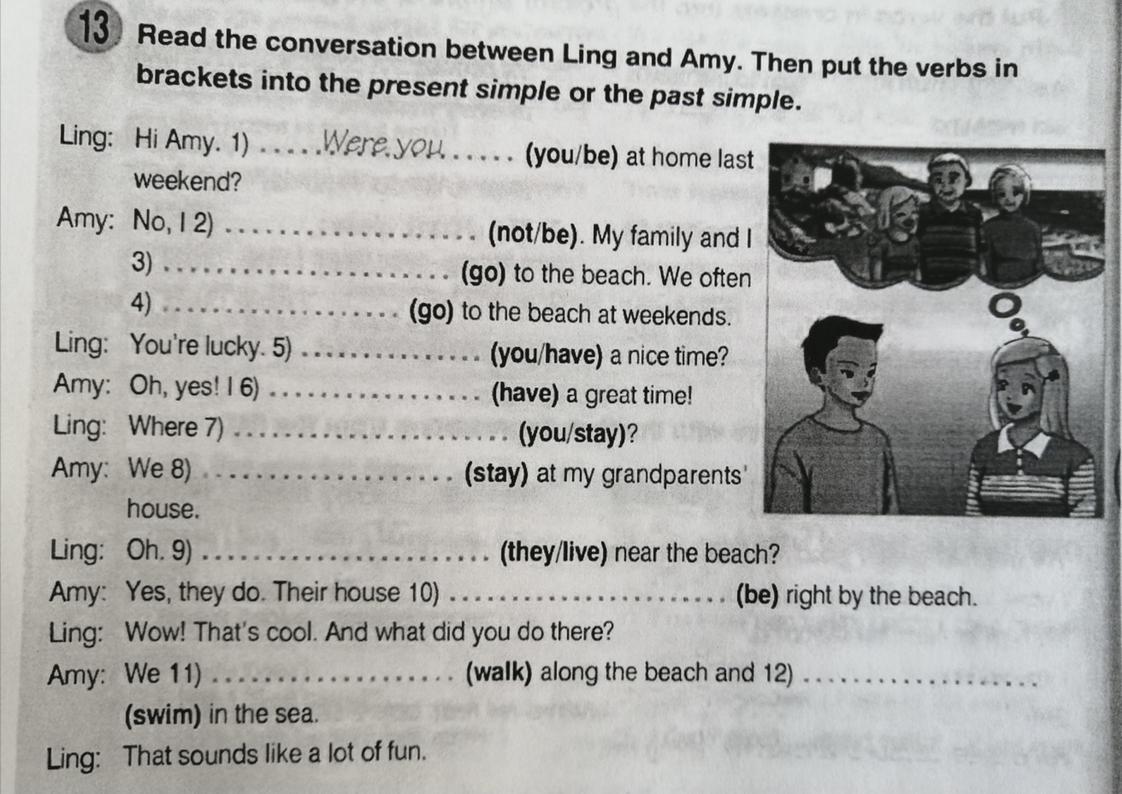 - Amy: No, I 2) was not. My family and I 3) went to the beach. We often 4) go to the beach at weekends.
