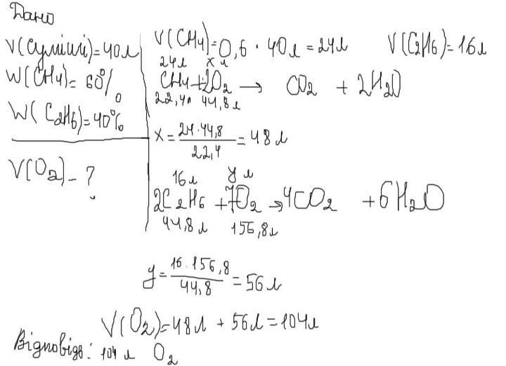 Обчислити об‘єм (л) кисню, що потрібен для спалювання 50 л суміші, яка містить 40% ацетилену і 60% етану.