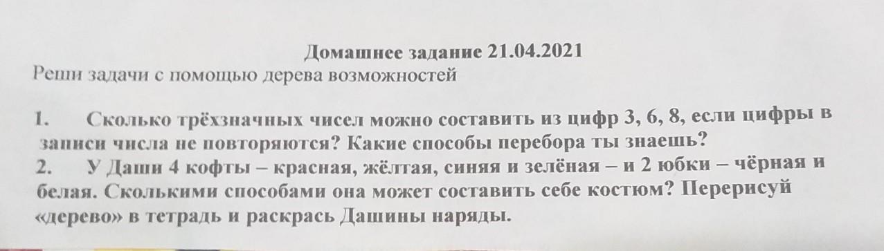 2) у Даши четыре кофта Красная жёлтая синяя и Зелёная и две юбки чёрные и белые Сколькими способами она может составить себе костюм? перерисуй дерево в тетрадь и раскрась Дашины наряды.