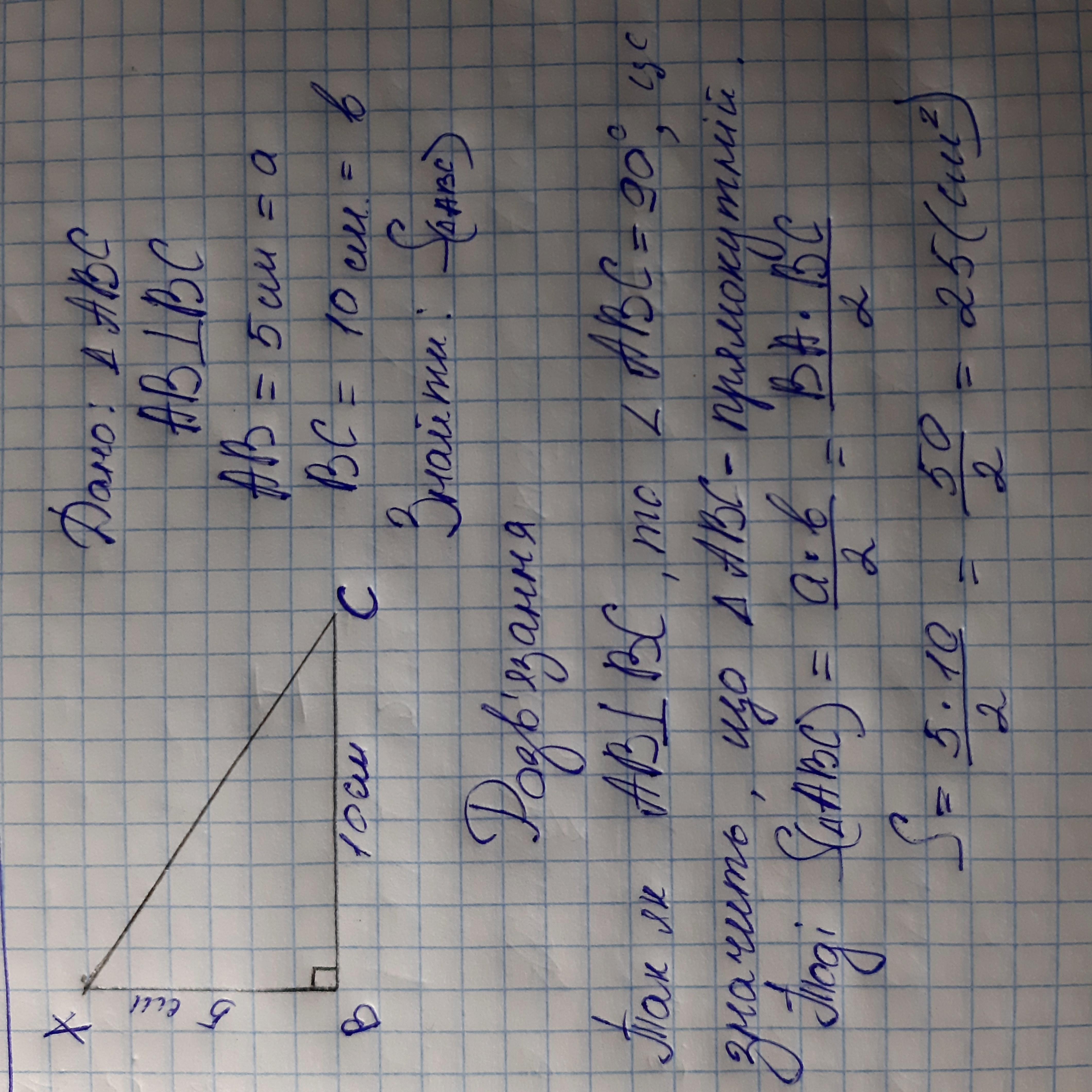 у трикутнику АВС, ВС=а, АВ перпендикулярна ВС, АВ= в. знайдіть площу трикутника якщо, a=10 cм,в= 5 см