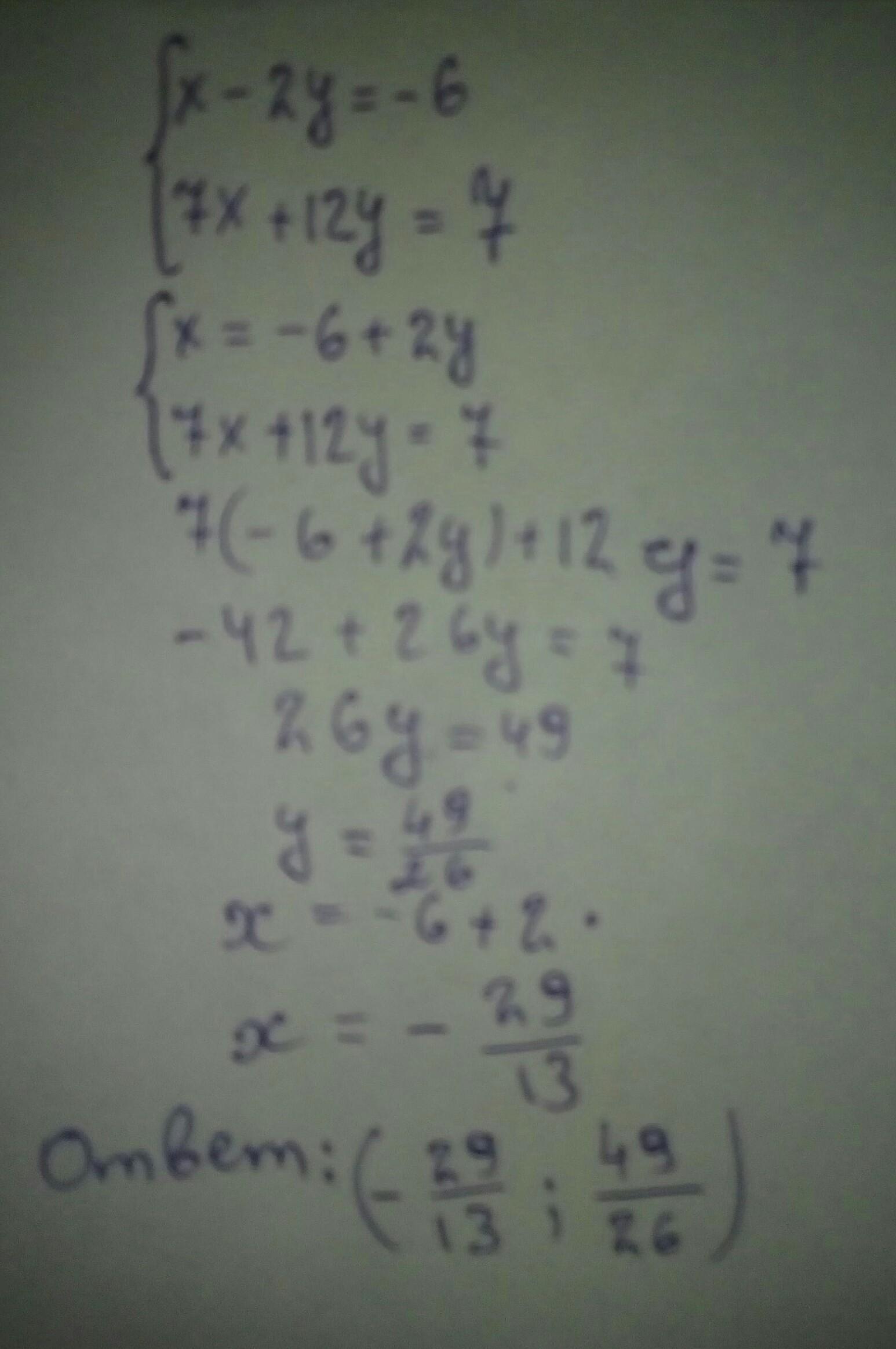 Розв'яжи систему рівнянь методом підстановки: {x−2y=−6,7x+12y=7.
