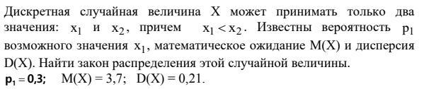 D(X)=М(Х²)-М²(Х)=0.3 х₁²+0.7х₂²-3.7²=0.21