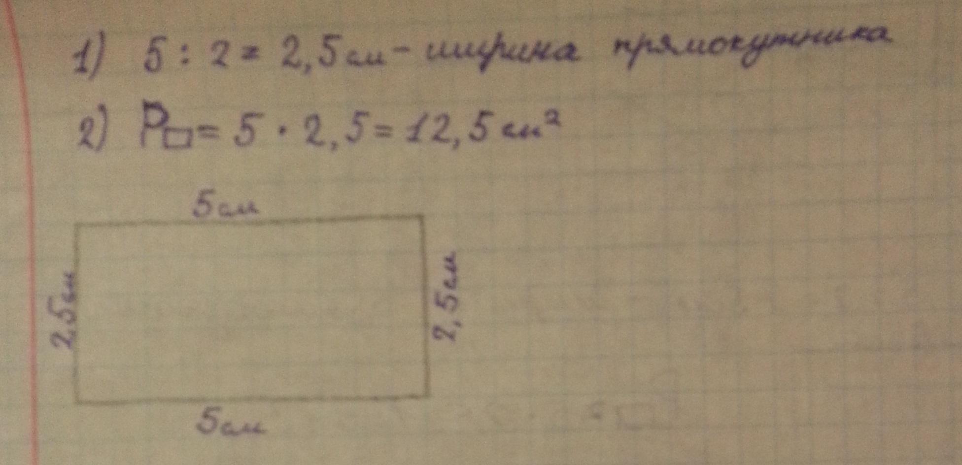 Здраствуйте помогите пожалуйста:Накрели прямокуиник, довжина якого 5 см, а ширина удвічі менша. Визнач площю прямокутника?