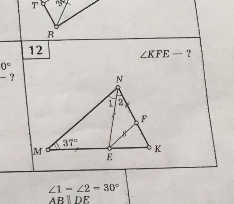 <MNE = <NEF = 37°, т.к. углы у равноб. треун. при основании равны, <FNE = <NEF = 37°, <EFN = 180° - 37°×2 = 106°, т.к. сумма смежных углов равна 180°, то <KFE = 180 - <EFN = 180 - 106 = 74°.