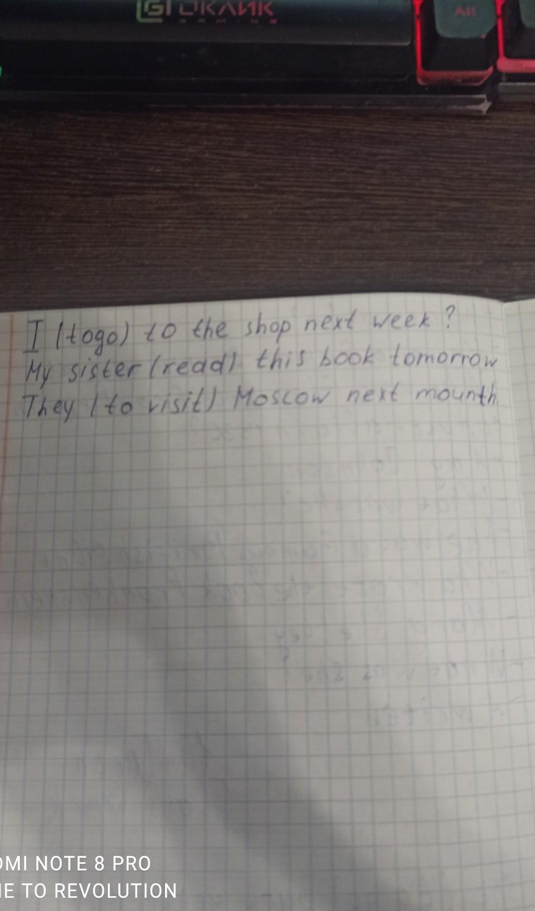 1. первый вопрос у тебя написан неправильно,правильно будет Will I go to the shop next week?