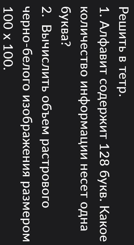 1. смотри Алфавит содержит 128 букв, нам надо возвести 2 в какую то степень чтобы получить 128, отсюда 2 в 7 степени = 128 (почему 2, т.к. обусловлено двоичной системой кодирования). 2. Нам дана картинка 100х100, и черно-белый экран, отсюда мы просто 100 * 100 * 1 бит (1 бит всегда при черно-белом экране) = 10000 бит можно перевести в байт, 8 бит = 1 байт, следовательно 10000 бит / 8 байт = 1250 байт, а в 1 Килобайте или Кб = 1024байт (по старым стандартам, на данный момент 1 Кб = 1000 байт).