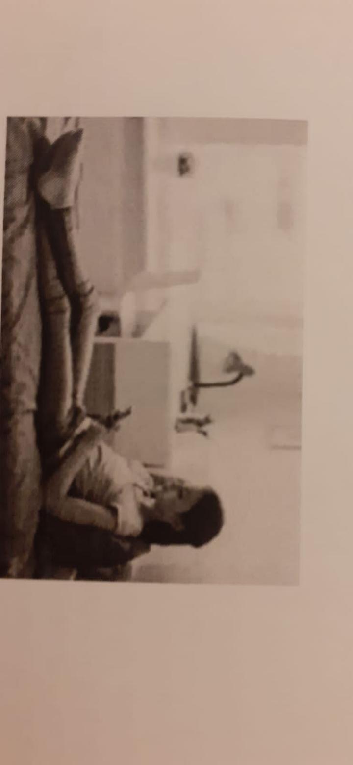 picture in black and white. The picture shows a teenage girl. This girl is wearing a T-shirt and pants. She is looking at the phone because it is possible that she is chatting with friends. In the photo she is smiling, I think she is in a good mood. , the bedside table is probably in her room