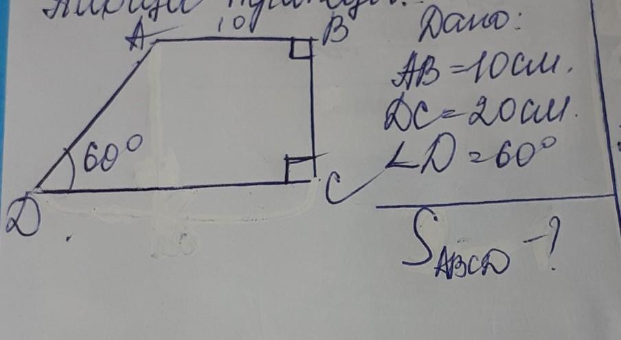 Площадь трапеции это: S=(AB+DC)AK/2=(10+20)10√3/2=150√3