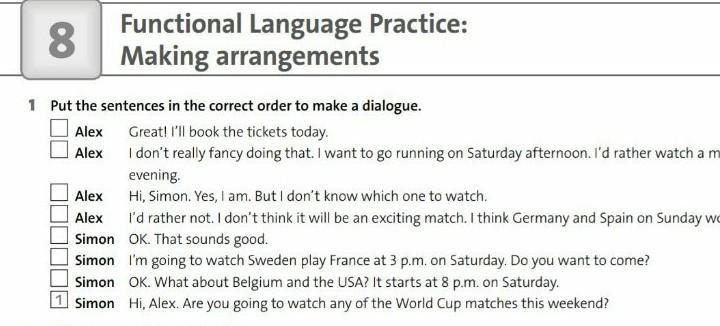 помогите срочно! дам 15 балов. нужно сделать диалог, точнее поставить правильно предложение, чтобы получился диалог!