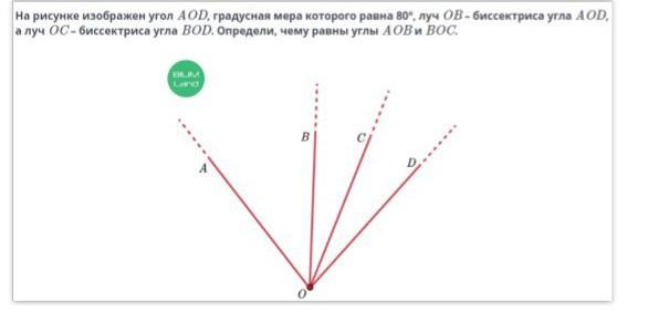 На рисунке изображен угол AOD, градусная мера которого равна 80º, луч OB – биссектриса угла AOD, а луч OC – биссектриса угла BOD. Определи, чему равны углы AOB и BOC.