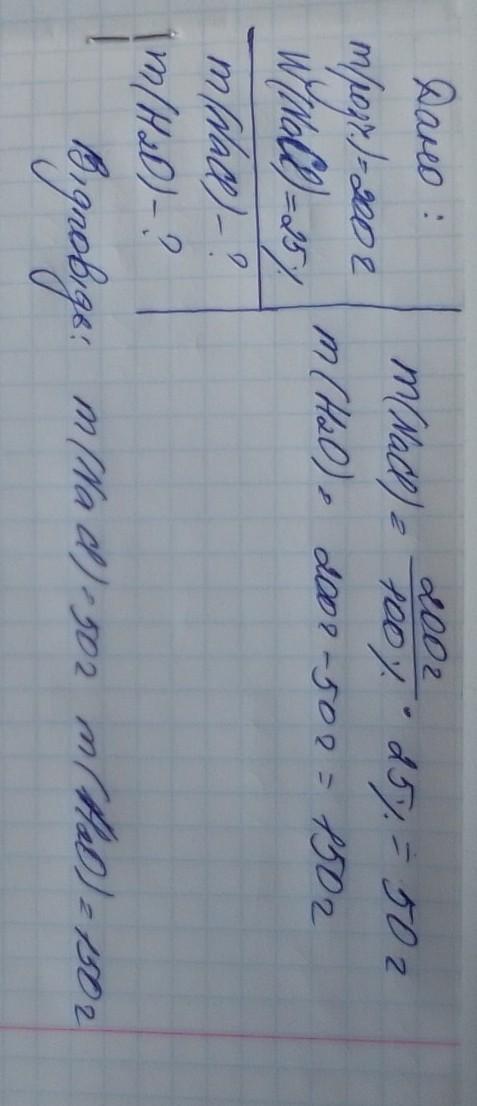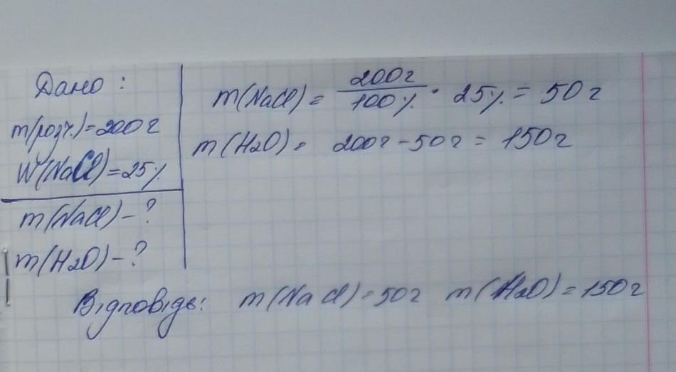 Обчисліть масу солі і води, що необхідно взяти для приготування 200 г розчину з масовою часткою 25%;