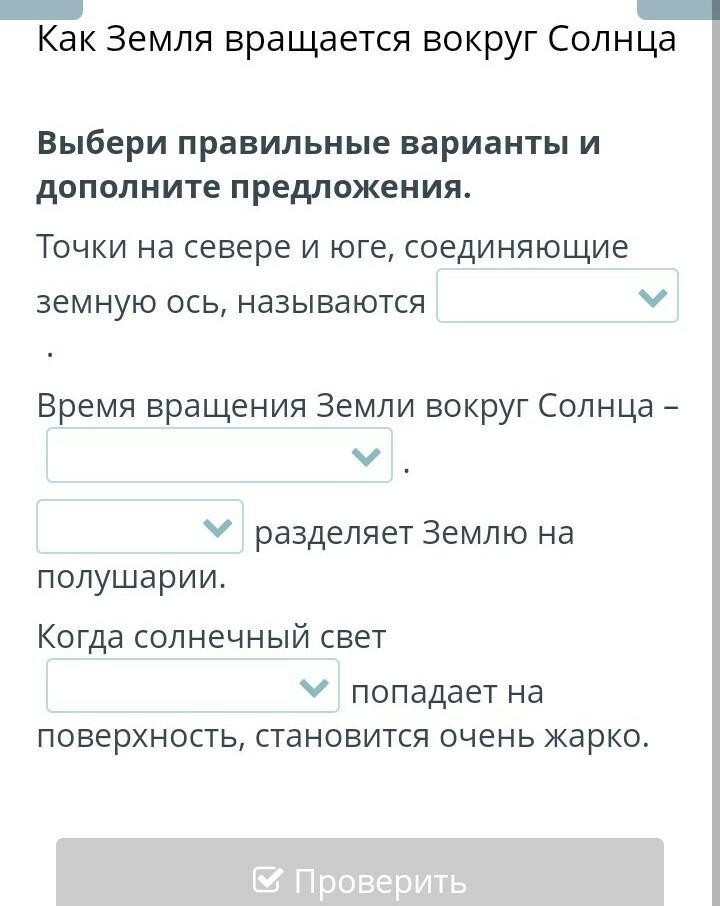 Точки на севере и юге, соединяющие земную ось, называются полюсом. Время вращения Земли вокруг Солнца - 365 дней 6 часов. экватор разделяет Землю на полушарии. Когда солнечный свет прямо попадает на поверхность, становится очень жарко.