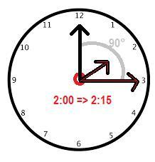 1) Если минутная стрелка повернётся на 90 градусов - время на часах будет показывать 2:15