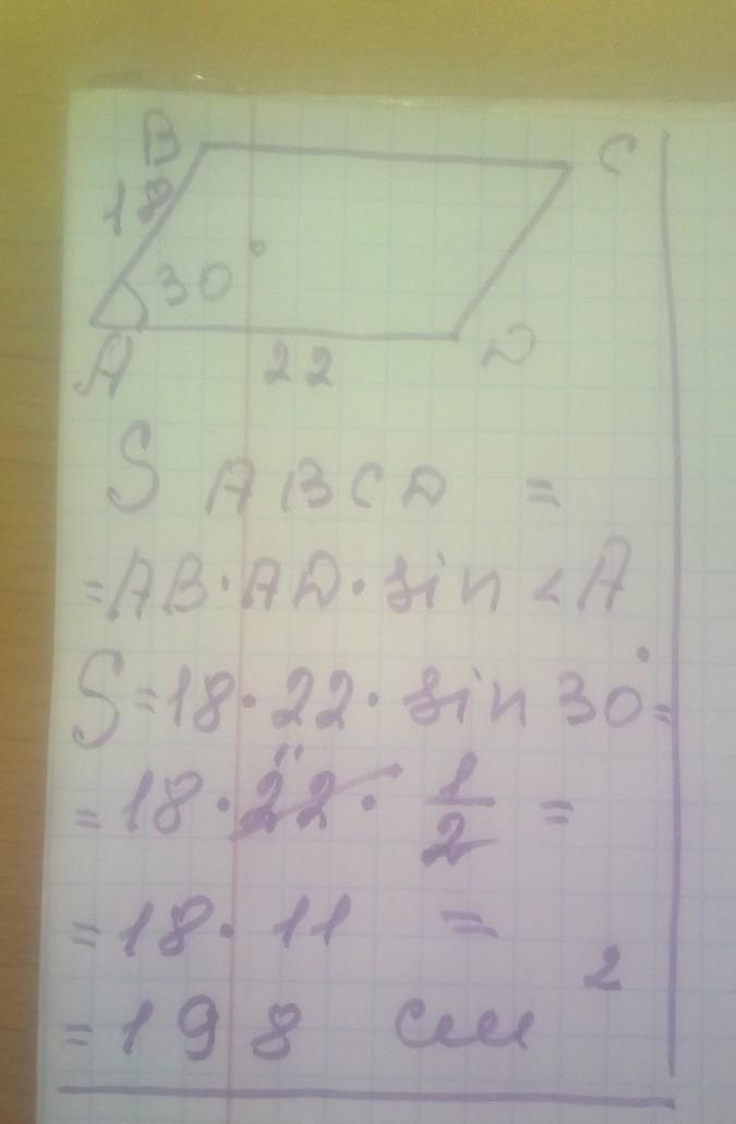 В парралелограме смежные строны ровны 18 и 22 см,а один из углов 30 гралусов. Найти площадь парралелограмма