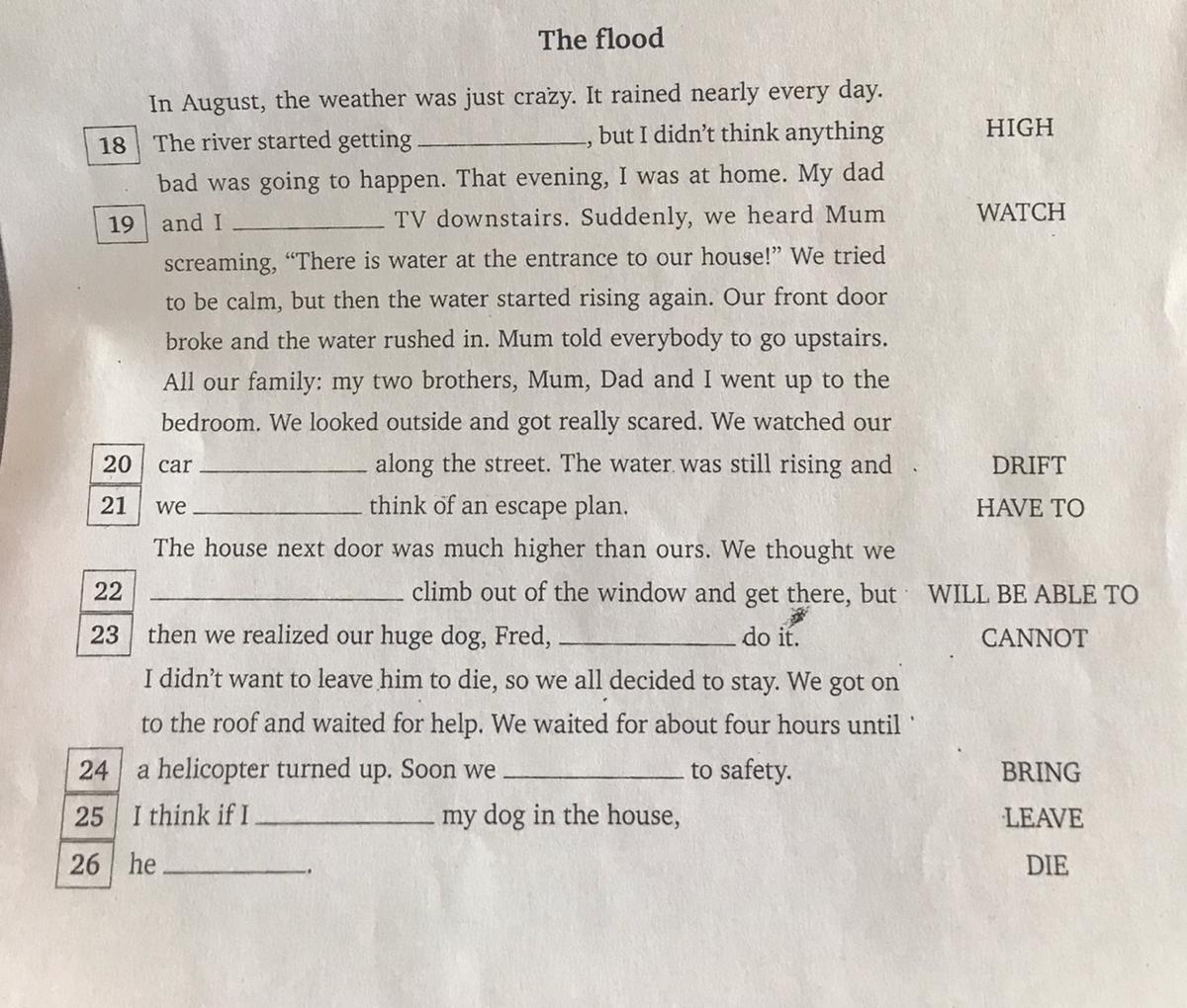 я не думал что произойдёт что-то плохое .Тем вечером я был дома.мой папа (отец) и я смотрели телевизор.Потом мы услышали как кричит мама"вода течёт в дом (доме)" мы пытались быть спокойными но вода поднималась снова .Наша дверь проломилась и вода влилась . Мама сказала каждому подниматься наверх вся наша семья:мои 2 брата,мама,папа и я поднялись наверх в комнату (спальню) мы смотрелю наружу и были реально испуганы.Мы увидели нашу машину плывущую по улице .Вода всё ещё поднималась и мы начали придумывать план спасения .в соседнем доме дверь была больше чем наше.Мы подумали что сможем вылезти через окно и попасть туда но когда мы это сделали наша большая собака Фред не смогла сделать этого. Я не хотел оставлять его умирать и мы все решили остатся.Мы залезли на крышу и ждали помощи.Мы ждали около четырёх часов пока вертолёт не прибыл вскоре мы были в безопасности я думал если я покину свой дом мой пёс умрёт.