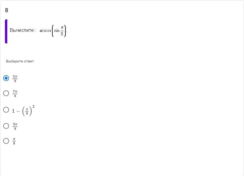 arccos(sin pi/8) = arccos(cos(3π/8)) = 3π/8