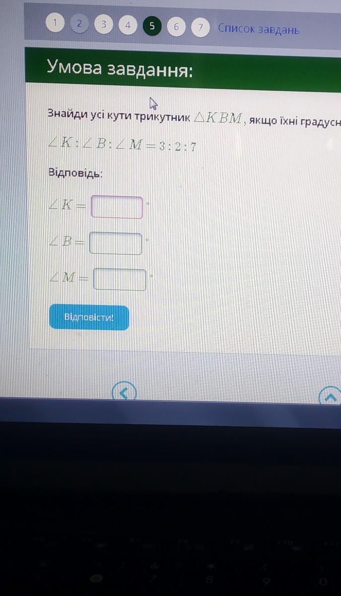 Знайдіть усі кути трикутник KBM, якщо їхні градусні міри відносяться як K: B M= 3:2:7