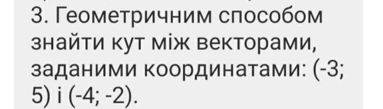 Геометричним способом знайти кут між векторами заданим координатами (-3;5) і (-4;-2)