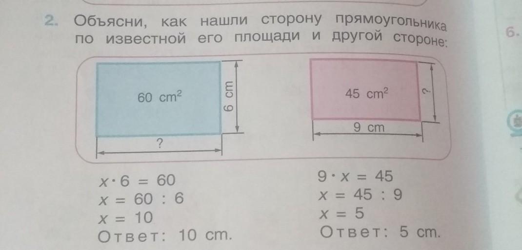 формула площади a*b=S(можно и так S=а*b),нам неизвестно одну сторону а,но есть вторая сторона и площадь,исходя из этого мы можем создать уравнение,где неизвестную сторону обозначим "х",а вторую сторону и площадь подставим в формулу.