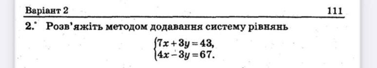 слаживаем два уравнения 7х+3у+4х-3у=43+67...
