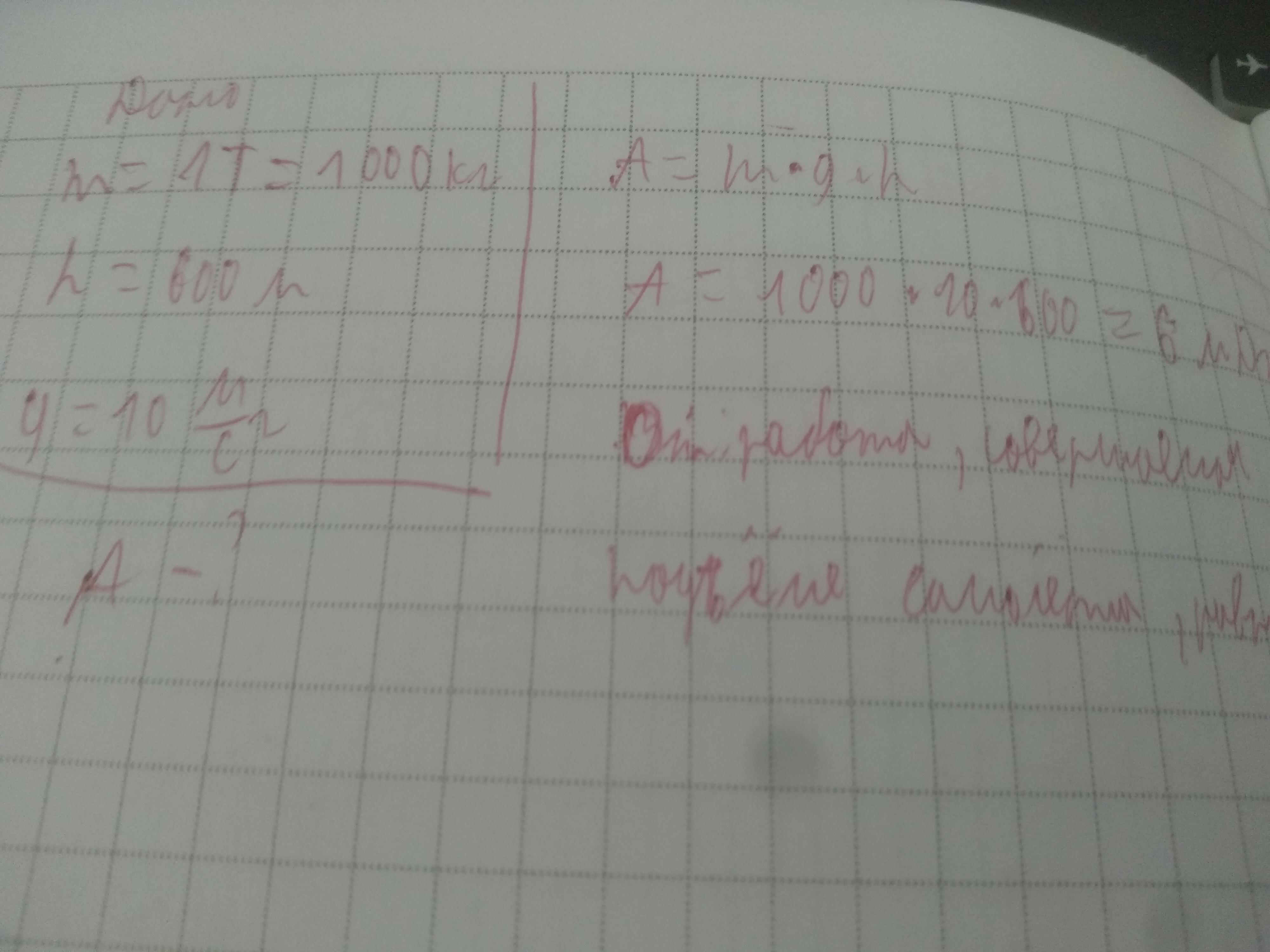 Самолёт массой 1 т поднялся на высоту 600 м. Какая работа затрачена на подъём?