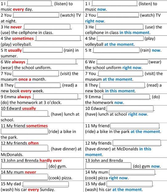 тут всё намного проще, синим показано ключевые слова которые подсказывают кое что. в present continuous нужно добавлять в конце ing. он говорит про время которое идет прямо сейчас: im helping you with your homework right now- я помогаю тебе з домашкой прямо сейчас. просто добавляешь в конце ing и всё. а когдав конце буква е то убираешь ёё. ёще в некоторых словах как run-running. swim-swimming