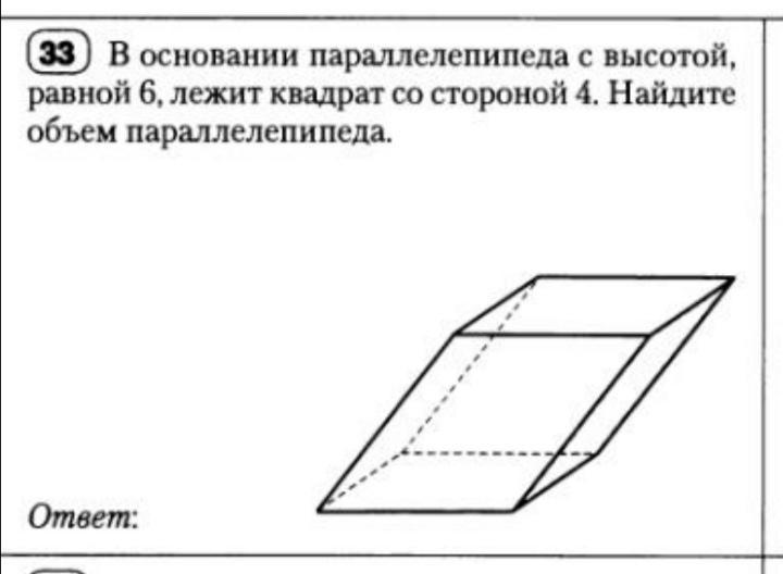 В основании параллелепипеда с высотой, равной 6, лежит квадрат со стороной 4. Найдите объем параллелепипеда
