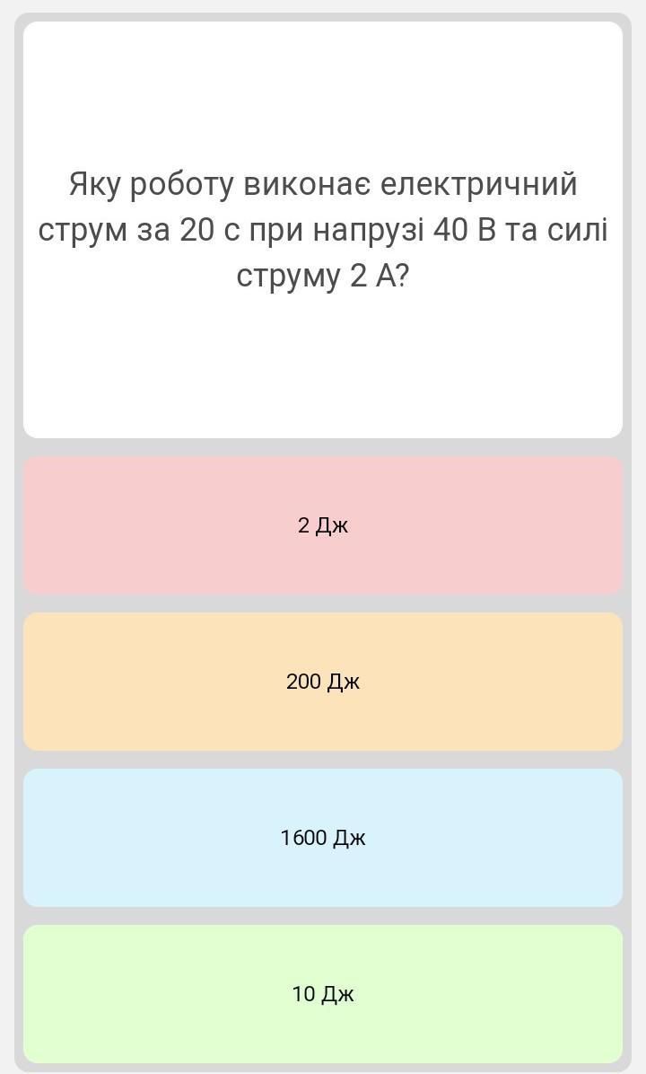Яку роботу виконає електричний струм за 20 с при напрузі 40 В та силі струму 2 А? Розв'язання (буду дуже вдячна)