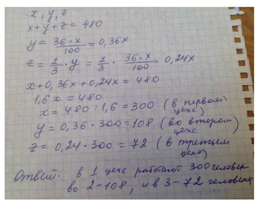 У трьох цехах фабрики працюе 480 робітників. Кількість людей,що працюють у другому цеху становить 0,36 кількості людей першого цеху, а кількість людей що працюють в третьому цеху, становить 2/3 кількості людей другого цеху. Скільки чоловіків працює в кожному цеху
