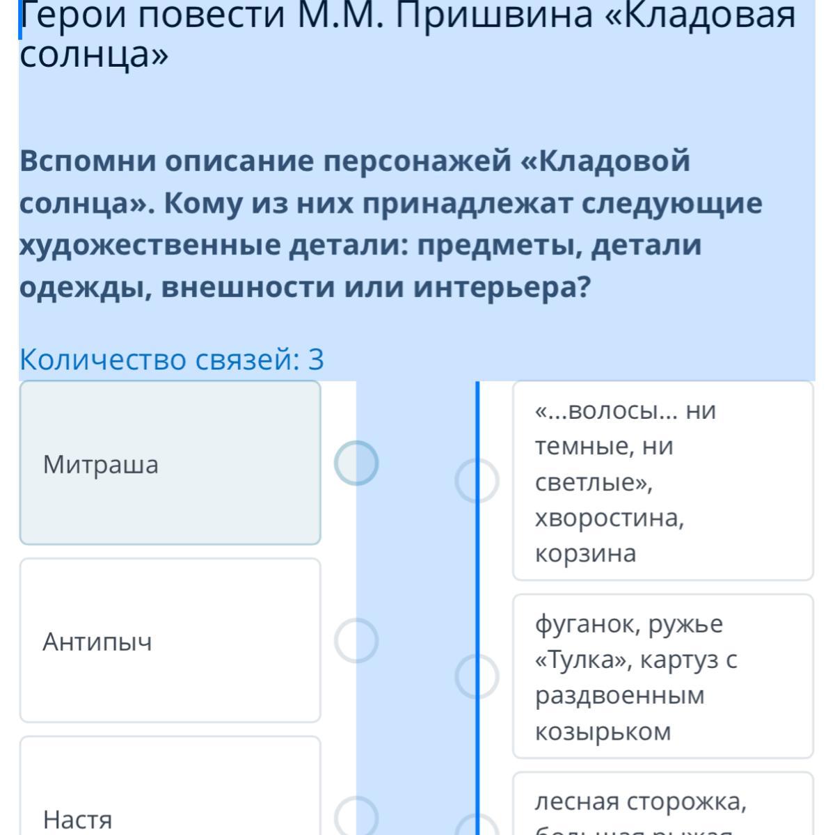 Вспомни описание персонажей «Кладовой солнца». Кому из них принадлежат следующие художественные детали: предметы, детали одежды, внешности или интерьера?