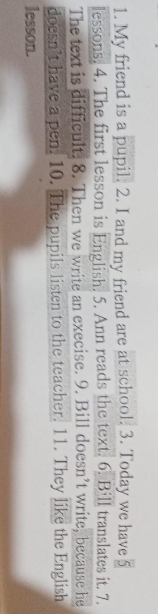 doesn't have a pen. 10. The pupils listen to the teacher. 11. They like the English