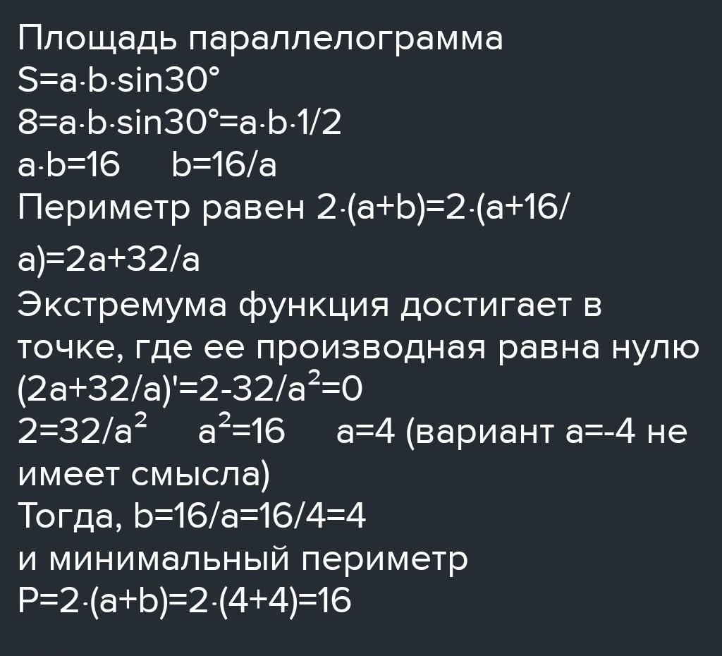 2-2S/a=0, a=√S -при заданной S наименьший периметр имеет квадрат со стороной a=√S