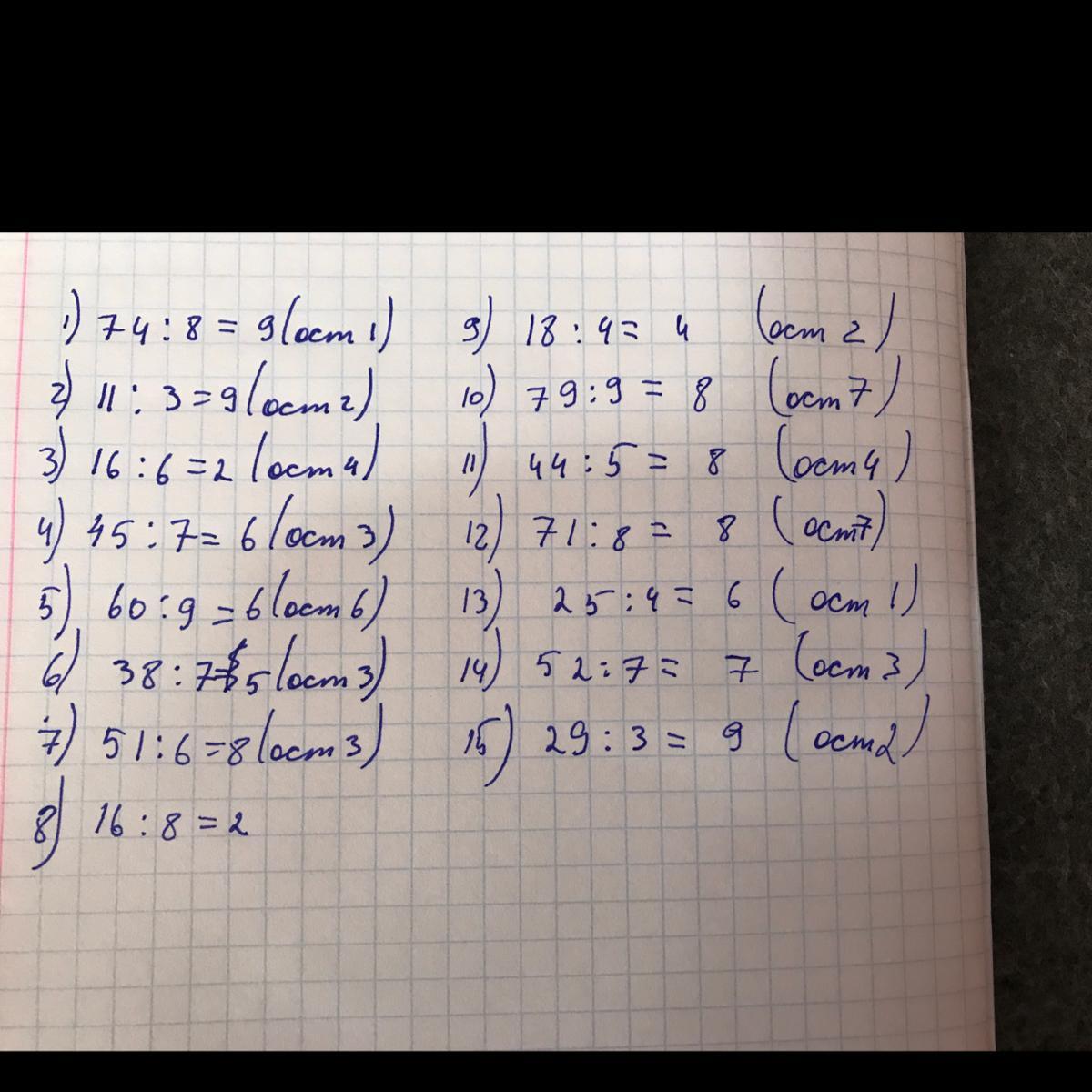 Ответ 74:8=9(ост.1) 11:3=9(ост 2) 16:6=2(ост 4) 45:7=6(ост 3) 60:9=6(ост6) 38:7=5(ост 3) 51:6=8(ост3) 16:8=2 18:4=4(ост2) 79:9=8(ост7) 44:5=8(ост4) 71:8=8(ост7) 25:4=6(ост1) 52:7=7(ост3) 29:3=9(ост2)