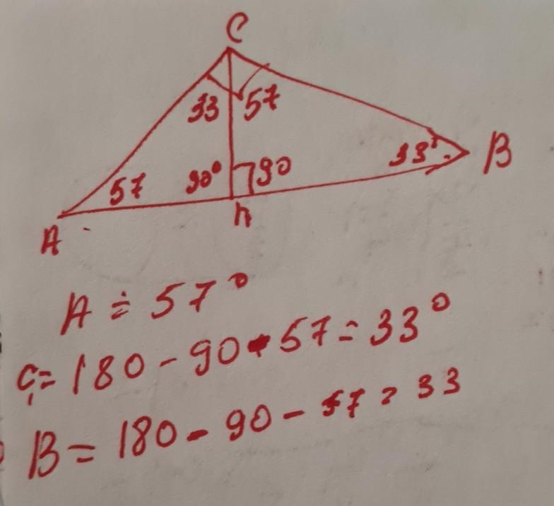 угол CHA- прямой, 90°, тогда угол 1 = 180-90-57= 33°