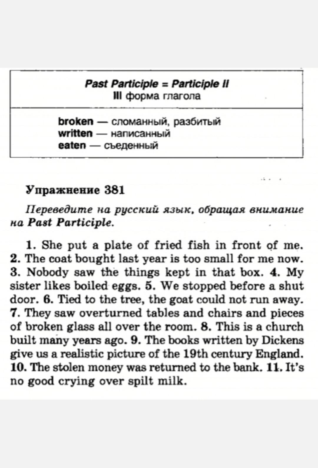 1. Она поставила передо мной тарелку жареной рыбы. 2. Пальто, купленное в прошлом году, мне сейчас маловато. 3. Никто не видел вещей, хранившихся в этом ящике. 4. Моя сестра любит вареные яйца. 5. Мы остановились перед закрытой дверью. 6. Привязанный к дереву коза не могла убежать. 7. Они видели перевернутые столы и стулья, а также осколки битого стекла по всей комнате. 8. Это церковь, построенная много лет назад. 9. Книги, написанные Диккенсом, дают нам реалистичную картину Англии XIX века. 10. Похищенные деньги возвращены в банк. 11. Нехорошо плакать над пролитым молоком.